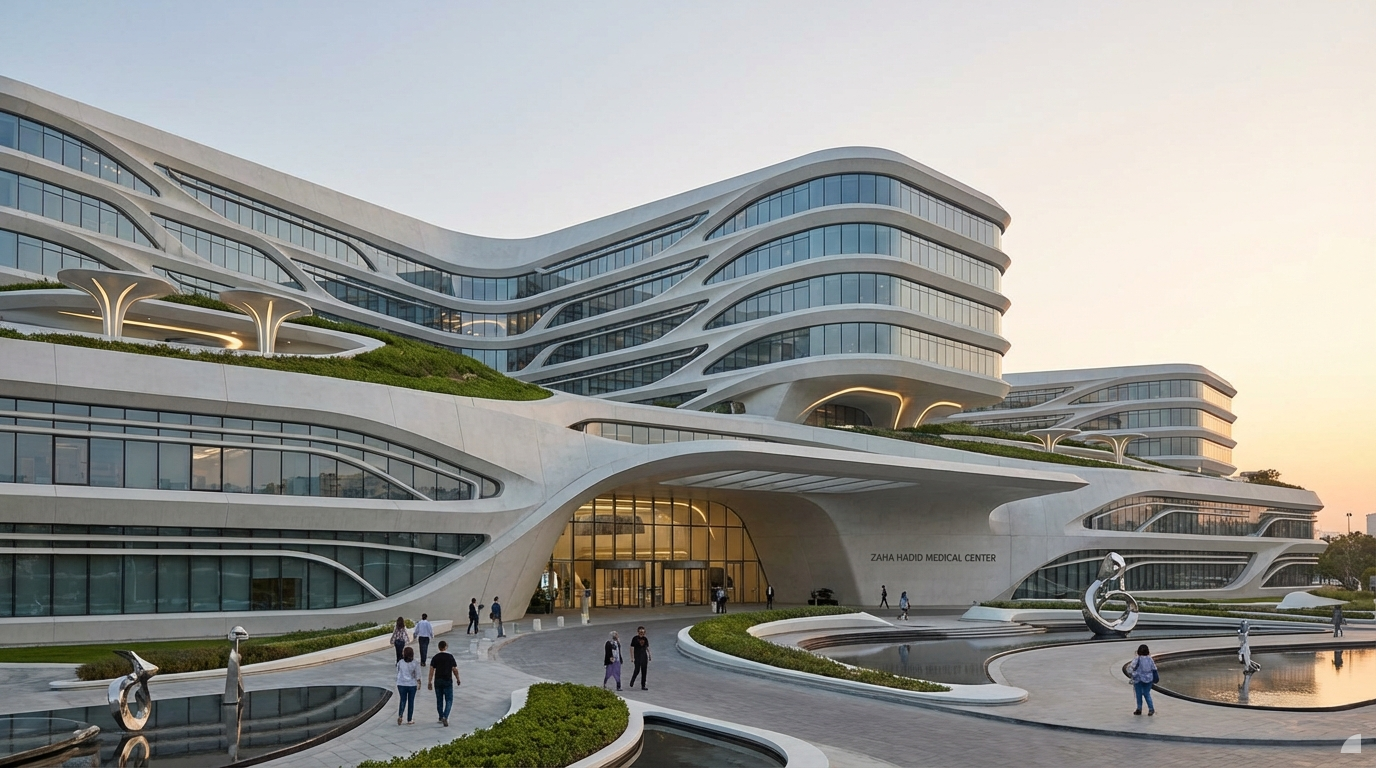A photorealistic exterior architectural visualization of a futuristic hospital, distinctly in the parametric, fluid, curvilinear style reminiscent of Zaha Hadid Architects. The building features sweeping, organic forms with dynamic, undulating facades