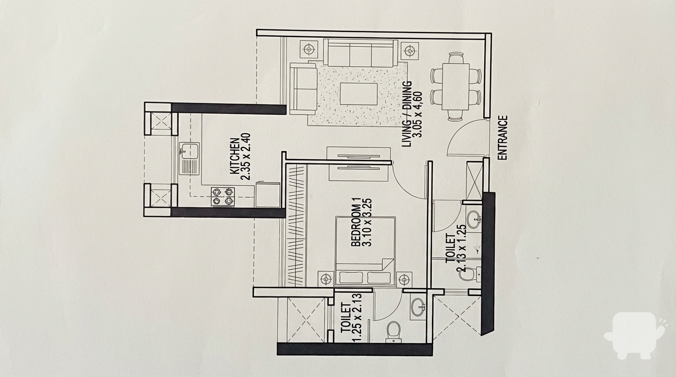 – Left side: open kitchen with upper and lower cabinets; dining area beside it.