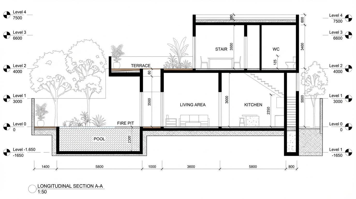 Design a complete landscape for the site, including curved pathways, planting areas, ground lighting, and subtle water-themed elements.